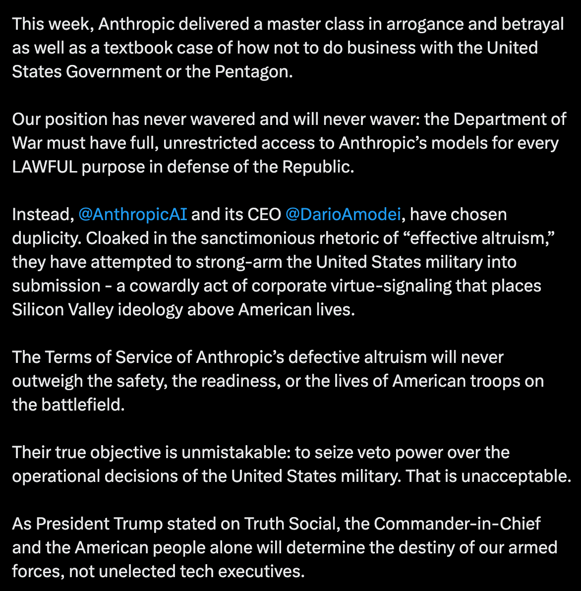 I also thought the language in Hegseth’s tweet accusing Anthropic of “corporate virtue signaling” that was “cloaked in sanctimonious rhetoric of ‘effective altruism’”, were curious words for a man who previously worked as the co-host of Fox & Friends. One wonders if someone whispered something about effective altruism and leftism, in passing, to the right people at the right time.